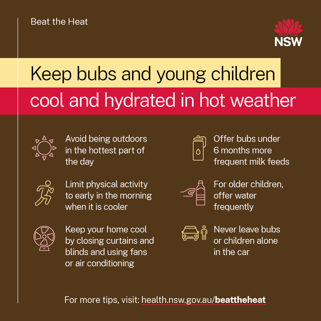- The Royal Women’s Hospital has information about heatwave precautions for babies and young children.
