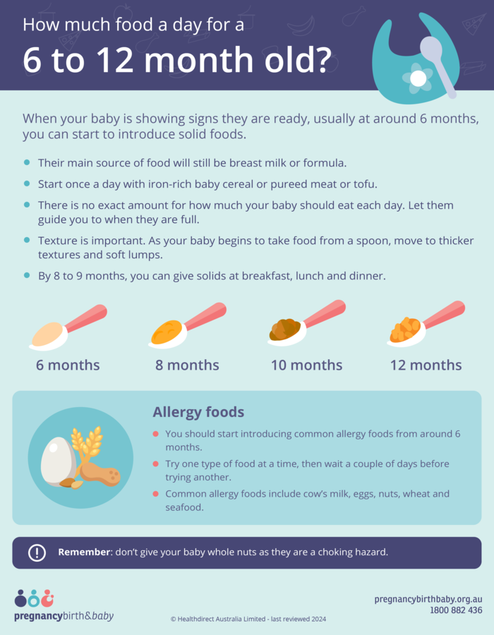 - There is no exact amount for how much your baby should eat each day. Try different foods and let them guide you to when they are full.